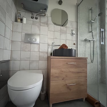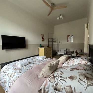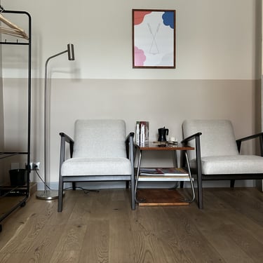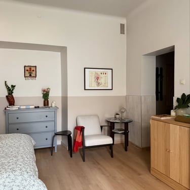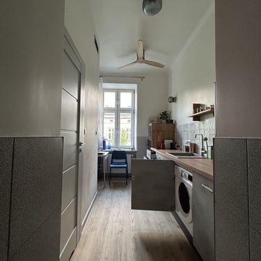 The apartment features a bright and cosy bedroom with a double bed, a separated, fully equipped kitchen with modern appliances and a minimalistic bathroom with a walk-in, glass wall shower. High speed Internet and air fans are available throughout the apartment. The bright bedroom with armchairs provides a relaxing space with access to smart TV.
