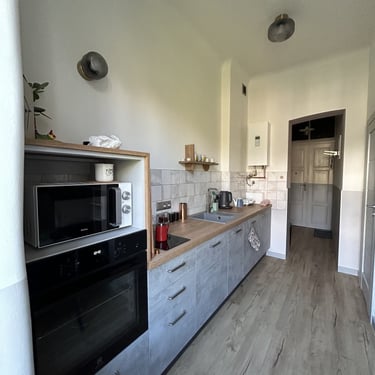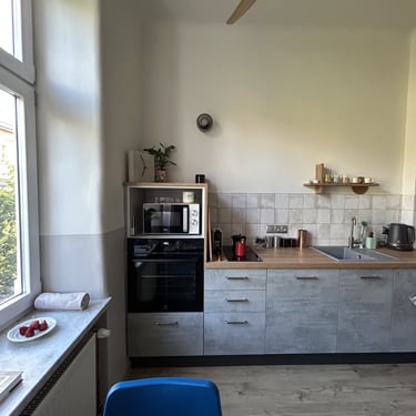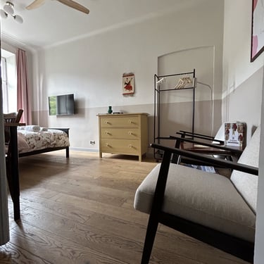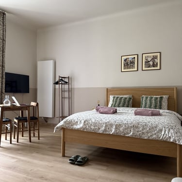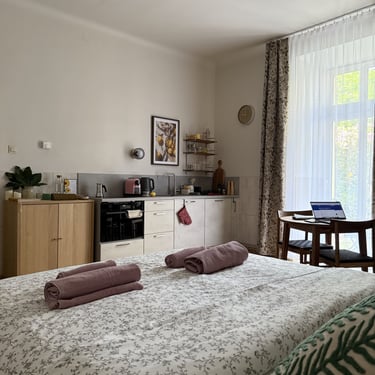 This comfort studio has 37 sqm space is located on ground floor and features a wide double bed, a comfortable armchair, a small dinner table, kitchen annex with a fridge and stove. Big balcony window leads out into the garden where you can relax.